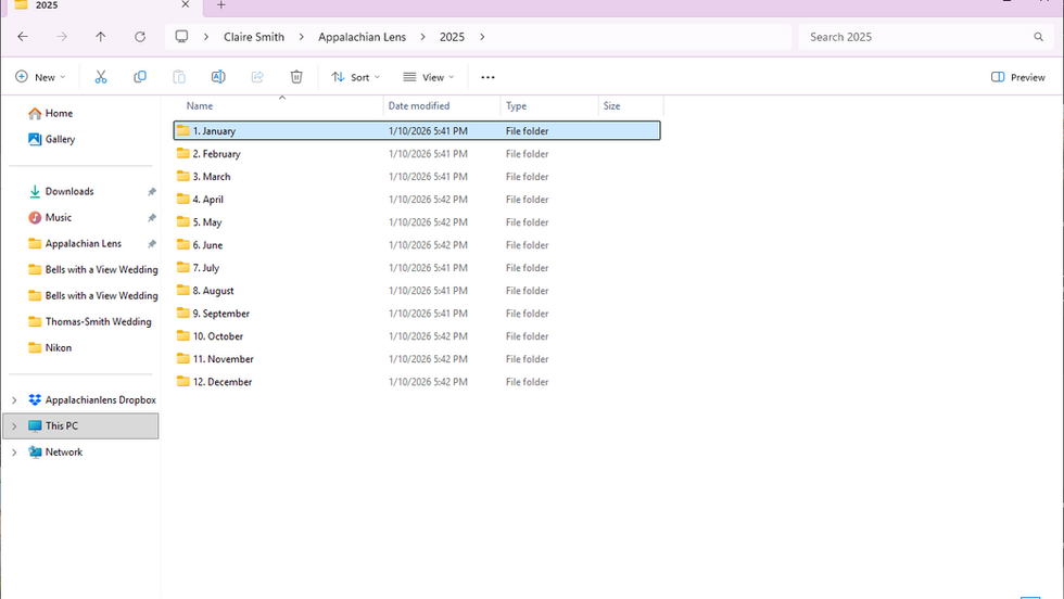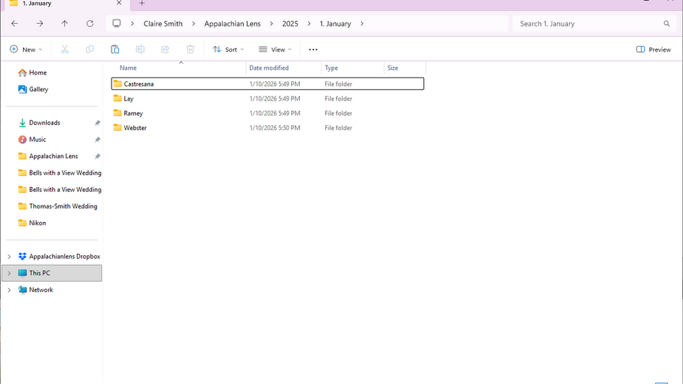 Lightroom – Store your Lightroom catalog in this folder and name it after the session (client last name or event name). This keeps your catalog tied directly to the files it contains.